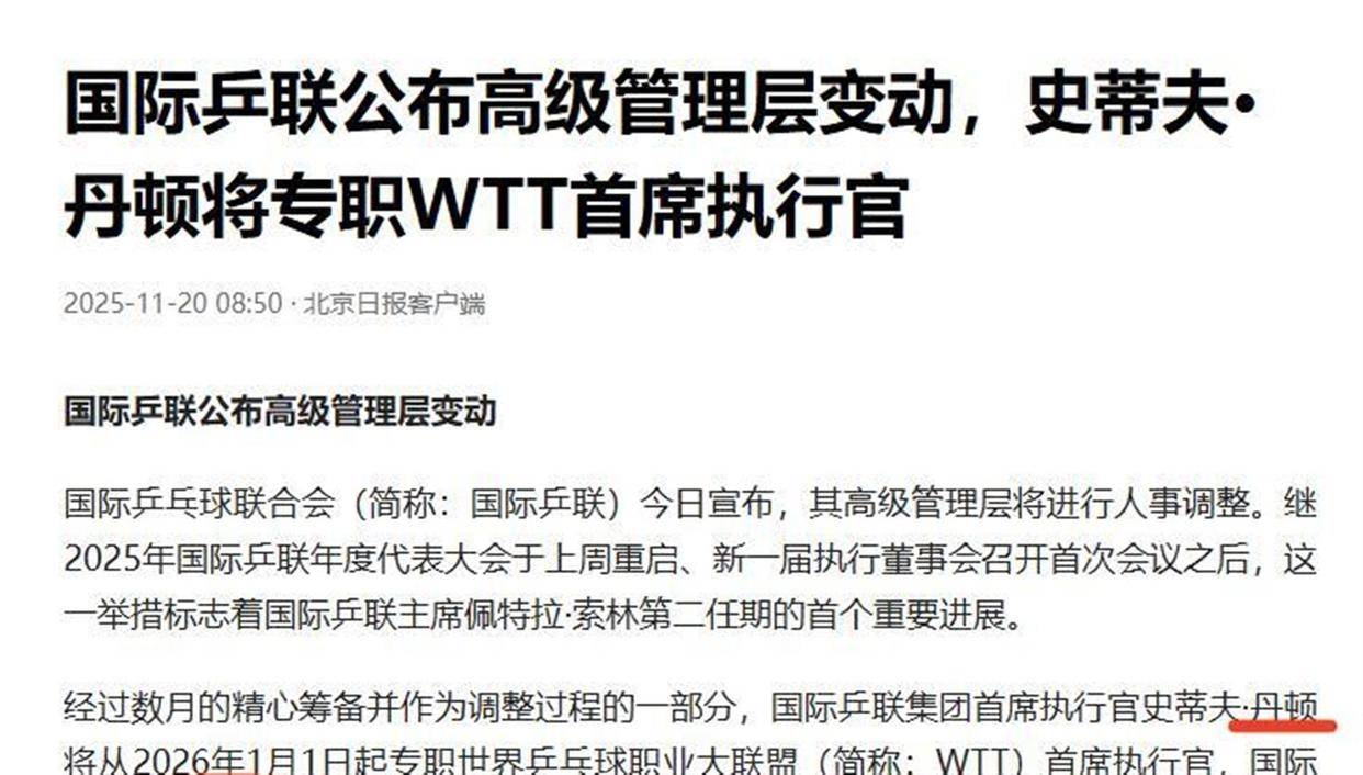 เสียงสะท้อนของ "ปรากฏการณ์ฟาน เจินตง" ได้ส่งผลกระทบอย่างรวดเร็วถึงระดับสูงของสหพันธ์เทเบิลเทนนิสระหว่างประเทศ (ITTF) ในเดือนพฤศจิกายน 2025 ITTF ได้ประกาศการเปลี่ยนแปลงบุคลากรครั้งสำคัญหลายประการ: สตีฟ แดนตัน ประธานเจ้าหน้าที่บริหารกลุ่ม จะเข้ารับตำแหน่งประธานเจ้าหน้าที่บริหารของ WTT แบบเต็มเวลาตั้งแต่วันที่ 1 มกราคม 2026 เป็นต้นไป; ในขณะเดียวกัน ราอูล คาร์ลิน เลขาธิการทั่วไปของ ITTF จะลงจากตำแหน่ง ในแถลงการณ์อย่างเป็นทางการ ITTF ระบุว่า การดำเนินการครั้งนี้มีวัตถุประสงค์เพื่อให้ WTT มีผู้นำที่มีความมุ่งมั่นมากขึ้นในการขับเคลื่อนกีฬาไปสู่ระยะใหม่