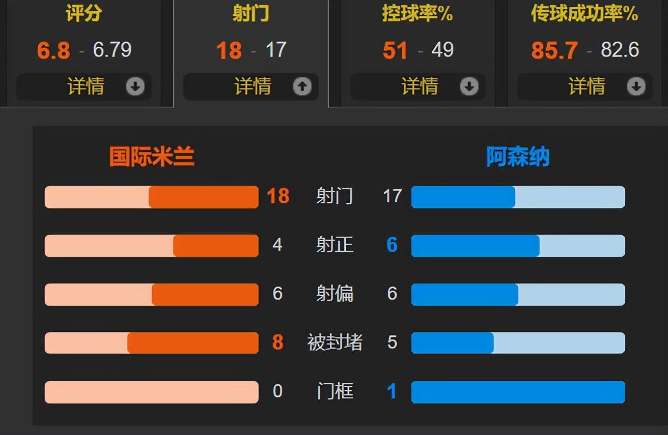 ตลอดการแข่งขัน อาร์เซนอลครองบอล 49% ยิงทั้งหมด 17 ครั้ง เข้าเป้า 6 ครั้ง ขณะที่อินเตอร์ มิลาน ยิงทั้งหมด 18 ครั้ง เข้าเป้า 4 ครั้ง การแข่งขันเป็นไปอย่างเปิดกว้าง โดยอาร์เซนอลแสดงให้เห็นถึงประสิทธิภาพที่เหนือกว่า