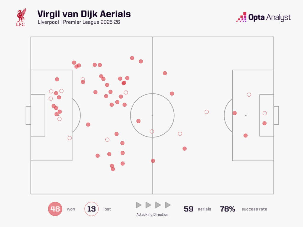 ปัญหาคือประสิทธิภาพของ Van Dijk ในด้านนี้ลดลงอย่างมากในฤดูกาลนี้ แม้ว่าสถิติจะแสดงให้เห็นว่าเขาชนะการดวลลูกกลางอากาศ 46 ครั้งจาก 59 ครั้ง คิดเป็นอัตราความสำเร็จ 78% แต่การควบคุมจุดลงจอดจริงของเขากลับแย่ลงอย่างมาก