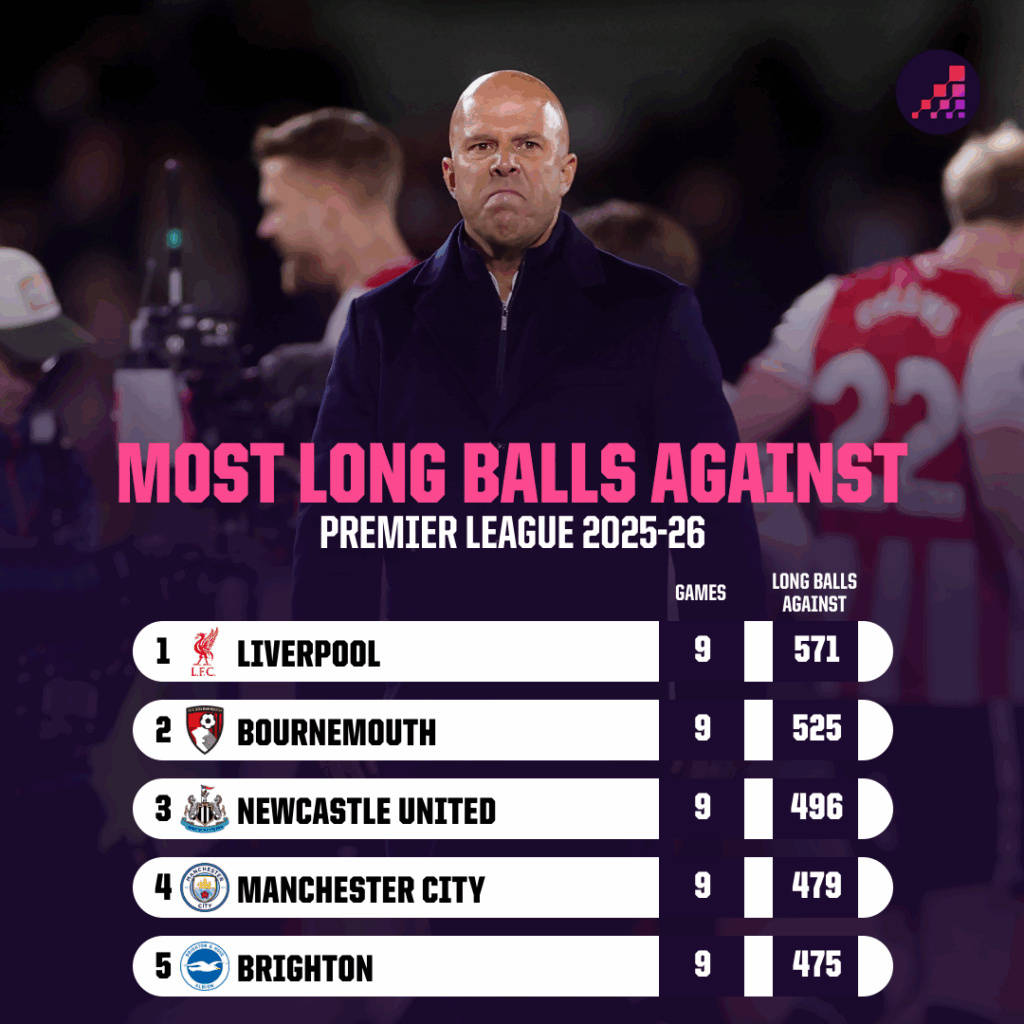 สถิติเปิดเผยว่า ลิเวอร์พูลได้เผชิญกับการผ่านบอลระยะไกลถึง 571 ครั้งใน 9 นัดของพรีเมียร์ลีกฤดูกาลนี้ ซึ่งเป็นจำนวนสูงสุดในบรรดาทุกทีม