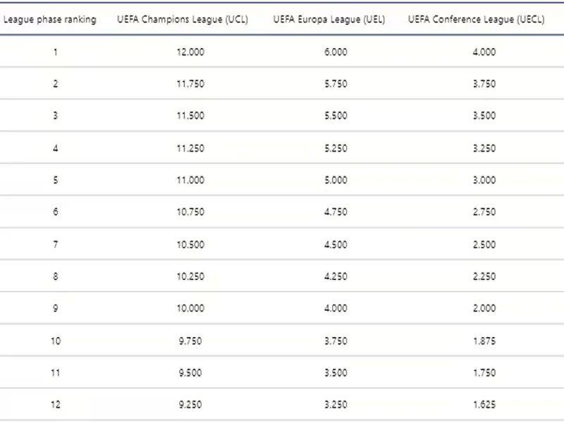 เนื่องจากการปรับปรุงระบบสัมประสิทธิ์ของยุโรปในฤดูกาลนี้ อันดับในรอบแบ่งกลุ่มจะส่งผลให้ได้รับคะแนนรางวัลที่แตกต่างกัน โดยตำแหน่งที่สูงขึ้นจะได้รับน้ำหนักมากขึ้นอย่างมีนัยสำคัญ ก่อนหน้านี้ การผ่านเข้ารอบ 16 ทีมสุดท้ายของแชมเปียนส์ลีกจะให้คะแนนรางวัลที่ใกล้เคียงกันระหว่างทีมต่างๆ แต่ตอนนี้มีการเปลี่ยนแปลง: ผู้ชนะกลุ่มในรอบแบ่งกลุ่มจะได้รับโบนัส 12 คะแนนอย่างมากมาย โดยตำแหน่งถัดไปจะได้รับคะแนนน้อยลงตามลำดับ