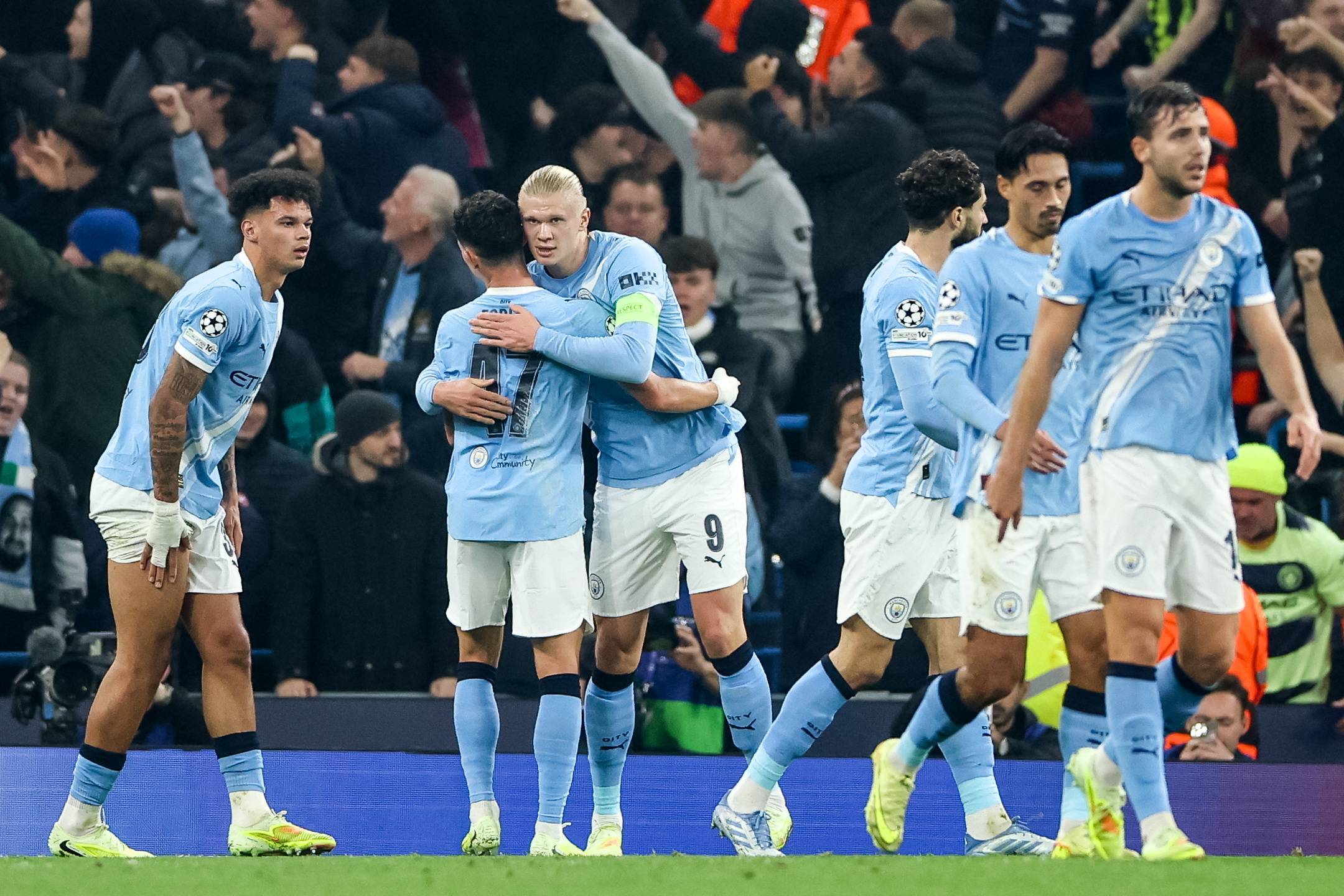 เมื่อวันที่ 5 พฤศจิกายน เออร์ลิ่ง ฮาแลนด์ (คนที่สองจากขวา) นักเตะแมนเชสเตอร์ ซิตี้ ฉลองการทำประตูที่สองของทีม Xinhua/EPA