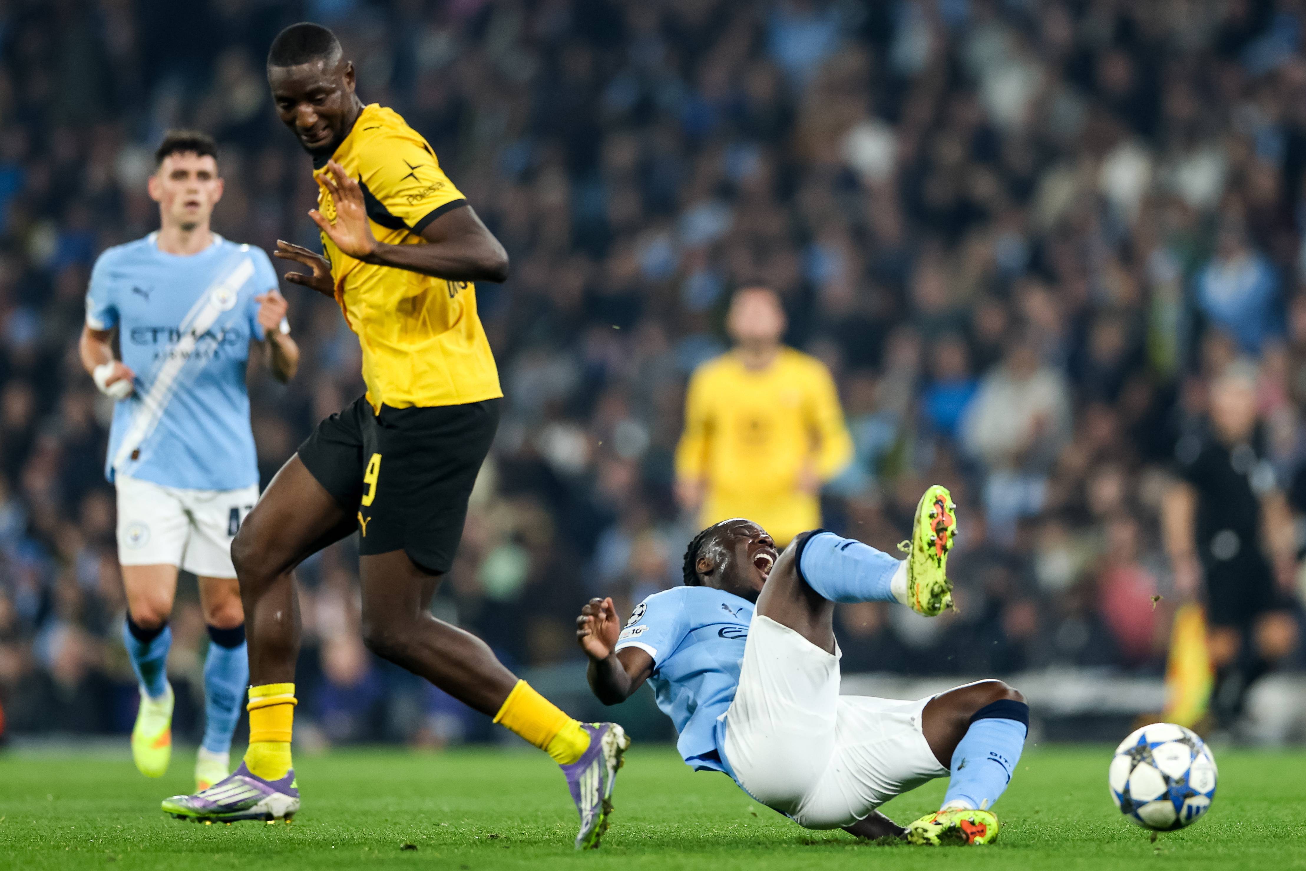 เมื่อวันที่ 5 พฤศจิกายน เออร์ลิง ฮาแลนด์ ของแมนเชสเตอร์ ซิตี้ (ขวา) ท้าทาย อิบราฮิมา เบนเซบายนี ของโบรุสเซีย ดอร์ทมุนด์ ระหว่างการแข่งขัน ซินหัว/EPA