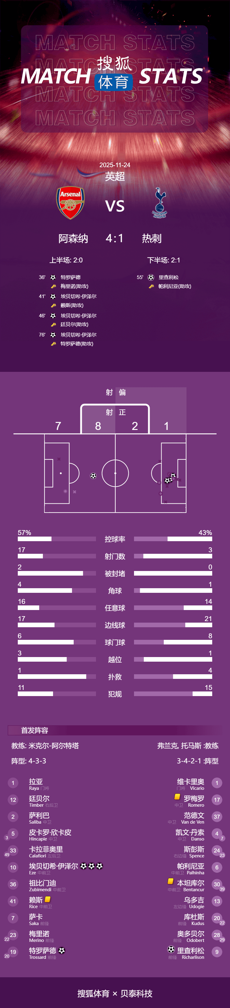 เวลา 00:30 น. ตามเวลาปักกิ่ง วันที่ 24 พฤศจิกายน การแข่งขันพรีเมียร์ลีก นัดที่ 12 ได้มีการแข่งขันดาร์บีลอนดอนเหนือ โดยอาร์เซนอลเปิดบ้านรับการมาเยือนของท็อตแนม ฮ็อตสเปอร์ในครึ่งแรก ทรอสซาร์ดเปิดสกอร์แรกให้กับอาร์เซนอล ก่อนที่เอเซจะบวกประตูที่สองให้ทีมนำห่างเป็น 2-0 ในช่วงพักครึ่ง หลังจากพักเบรก เอเซยิงเพิ่มอีกสองประตูเพื่อปิดท้ายชัยชนะ แม้ว่าริชาร์ลิซอนจะยิงประตูตีไข่แตกให้กับสเปอร์สด้วยการยิงข้ามหัวผู้รักษาประตู อาร์เซนอลเอาชนะไป 4-1 ที่บ้าน ขยายสถิติไร้พ่ายในทุกรายการเป็น 15 นัดติดต่อกัน ขณะนี้พวกเขานำหน้าเชลซี 6 คะแนนในตารางพรีเมียร์ลีก