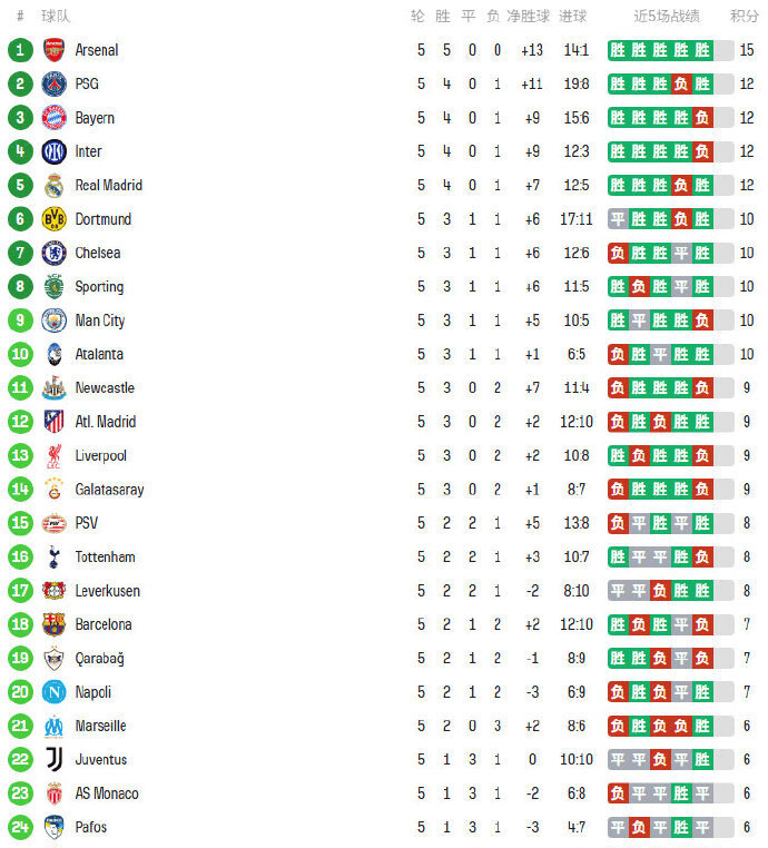 อันดับแชมเปียนส์ลีกพลิกผันหลังผ่านไปห้าแมตช์? อาร์เซนอลนำจ่าฝูงด้วยชัยชนะห้าเกมรวด! สองทีมต้องพบกับความพ่ายแพ้ครั้งแรก ขณะที่ลิเวอร์พูลและบาร์เซโลนาสะดุด _การแข่งขัน_ บาเยิร์น มิวนิค พบ อินเตอร์ มิลาน