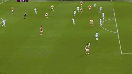 ในนาทีที่ 11 มาร์ติน โอเดการ์ด เป็นผู้ควบคุมการโจมตี. มาดูเอเก้ เตะบอลด้วยส้นเท้า, เบน ไวท์ ส่งลูกครอสจากเส้นหลัง, และเมเรโน่ โหม่งบอลเข้าประตู.