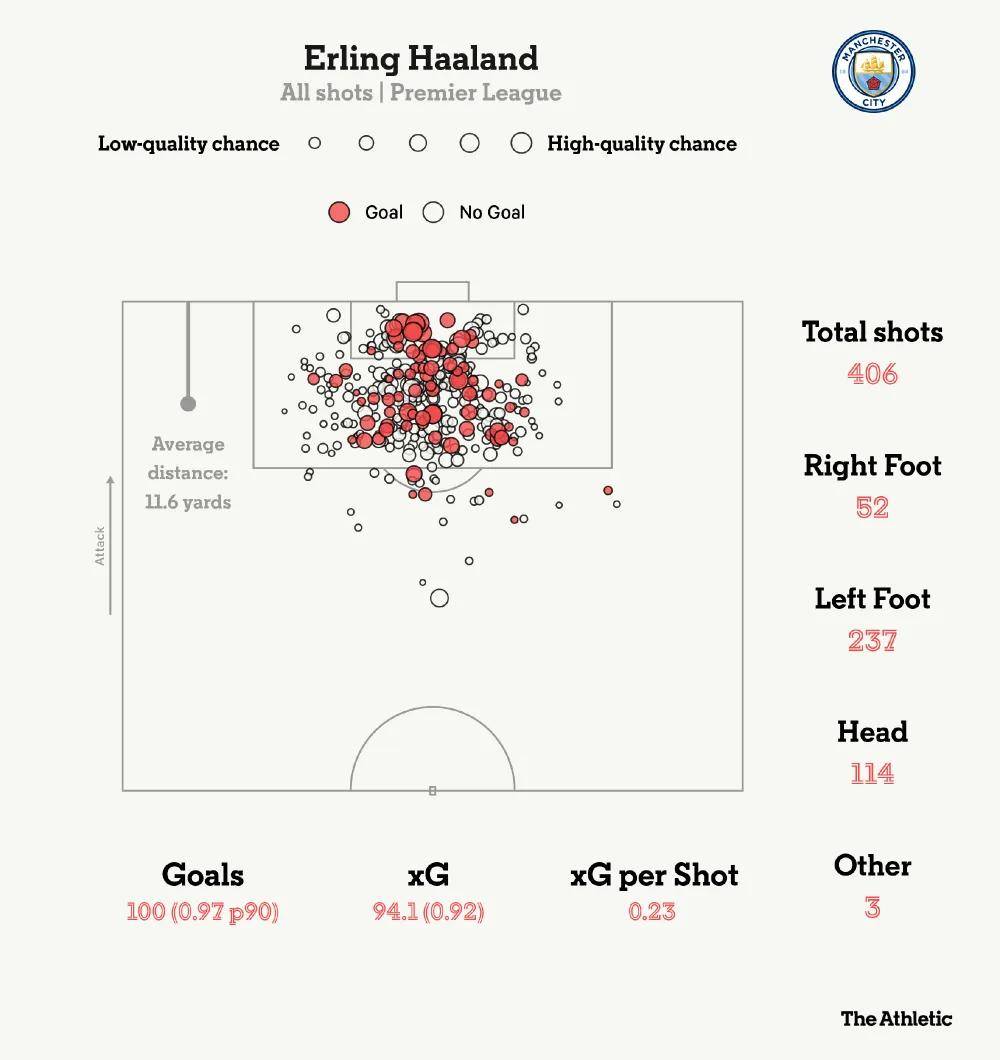 ฮาแลนด์ทำสถิตินี้ได้ในเพียง 111 นัดในพรีเมียร์ลีก ทำลายสถิติเดิมของอลัน เชียเรอร์ที่ทำได้ใน 124 นัด และทิ้งห่างดาวดังอย่างแฮร์รี เค인 (141 นัด), เซร์คิโอ อเกวโร่ (147 นัด), เธียร์รี อองรี (160 นัด) และโมฮาเหม็ด ซาลาห์ (162 นัด) ไว้ไกล