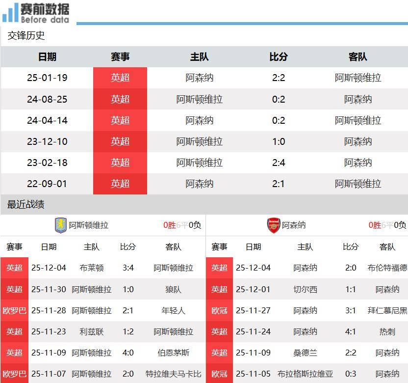 เวลา 20:30 น. ตามเวลาปักกิ่ง วันที่ 6 ธันวาคม การแข่งขันพรีเมียร์ลีกนัดที่ 15 จะเป็นการพบกันของสามทีมอันดับต้น โดยแอสตัน วิลล่า ทีมอันดับสาม จะเปิดบ้านต้อนรับการมาเยือนของอาร์เซนอล ทีมจ่าฝูง