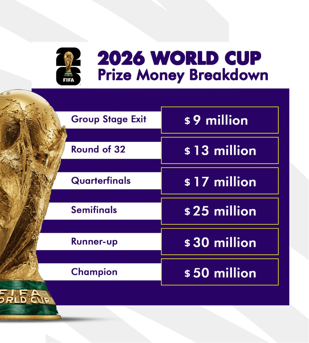 ตามข้อมูลที่เพิ่งเปิดเผยจากฟีฟ่า ฟุตบอลโลก 2026 ซึ่งร่วมเป็นเจ้าภาพโดยสหรัฐอเมริกา แคนาดา และเม็กซิโก จะมีการจัดสรรเงินรางวัลและเงินสนับสนุนรวมทั้งสิ้น 727 ล้านดอลลาร์สหรัฐ ให้กับ 48 ทีมที่เข้าร่วมแข่งขัน