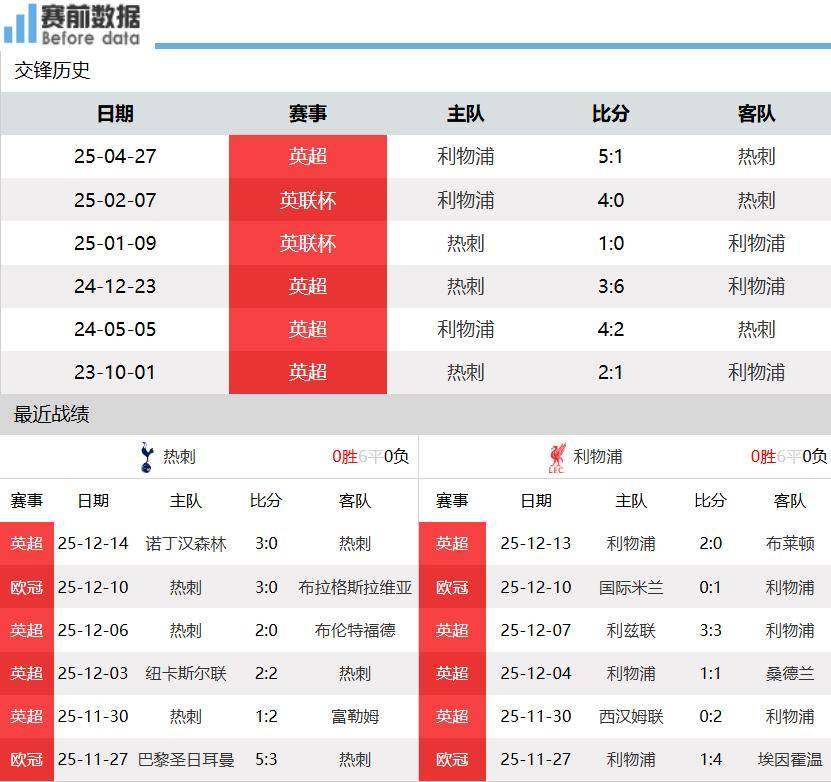 เวลา 01:30 น. ตามเวลาปักกิ่ง วันที่ 21 ธันวาคม การแข่งขันพรีเมียร์ลีก นัดที่ 17 จะเป็นการพบกันระหว่างสองทีมใหญ่จากกลุ่มบิ๊กซิกส์ โดยท็อตแน่ม ฮ็อตสเปอร์ จะเปิดบ้านรับการมาเยือนของลิเวอร์พูล