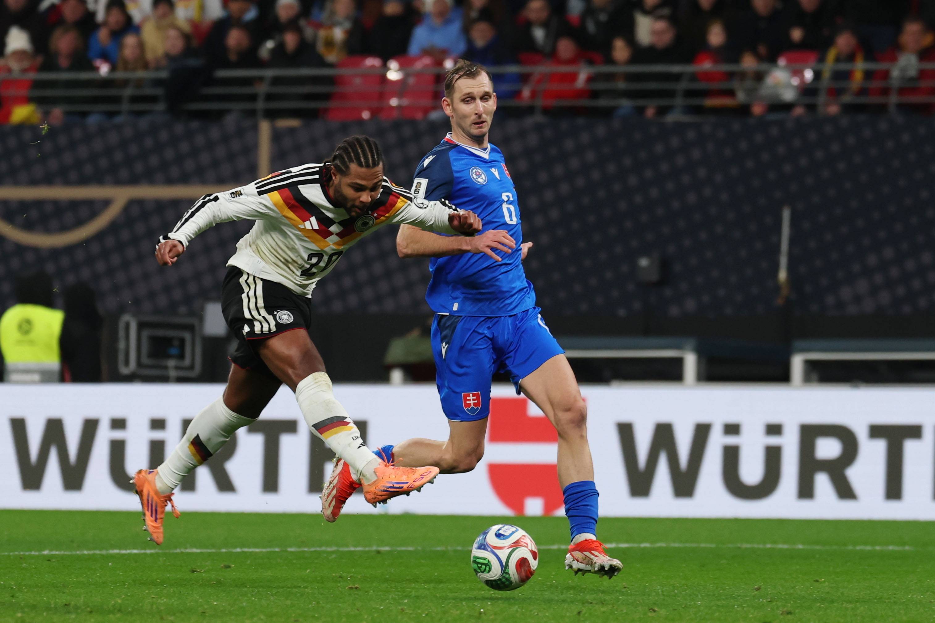 เมื่อวันที่ 17 พฤศจิกายน ลีออน โกเร็ตซ์ก้า ของเยอรมนี (ซ้าย) เข้าปะทะกับมาร์ติน ไซเบิลเลอร์ ของสโลวาเกียเพื่อแย่งบอล ซีเอ็นเอ/อีพีเอ