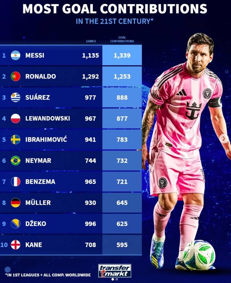 25 พฤศจิกายนในบรรดาตัวชี้วัดที่วัดอิทธิพลเชิงรุกแบบรอบด้านของนักฟุตบอล "การมีส่วนร่วมโดยตรงกับประตู" ถือเป็นค่าเงินที่ชัดเจนที่สุด การจัดอันดับในสหัสวรรษใหม่นี้ ซึ่งรวบรวมโดย Transfermarkt ที่มีความน่าเชื่อถือ แสดงให้เห็นถึงการครองความเป็นเลิศอย่างเด็ดขาดของเมสซี่ในมิติการโจมตี ประสิทธิภาพที่น่าทึ่งของเขาในการสร้าง 1,339 ประตูจากการลงเล่นให้สโมสร 1,135 นัด ทำให้เขาครองตำแหน่งสูงสุดในรายการนี้อย่างมั่นคง โดยเฉลี่ยมีส่วนร่วมโดยตรงกับประตู 1.18 ครั้งต่อเกมเมื่อเปรียบเทียบกันแล้ว คริสเตียโน่ โรนัลโด้ ซึ่งอยู่ในอันดับที่สอง มีจำนวนประตูตามหลังถึง 86 ประตู แม้จะลงเล่นมากกว่าถึง 157 นัด และยิงจุดโทษเข้าเกือบ 70 ครั้งก็ตาม สถิตินี้ไม่ได้สะท้อนเพียงแค่จำนวนประตูที่ทำได้เท่านั้น แต่ยังบ่งบอกถึงประสิทธิภาพและความสม่ำเสมอ ซึ่งเหนือกว่าบทบาทของผู้ทำประตูเพียงอย่างเดียว เพื่อชี้ให้เห็นถึงแก่นแท้ของระบบเกมรุกที่ครอบคลุมมากกว่า