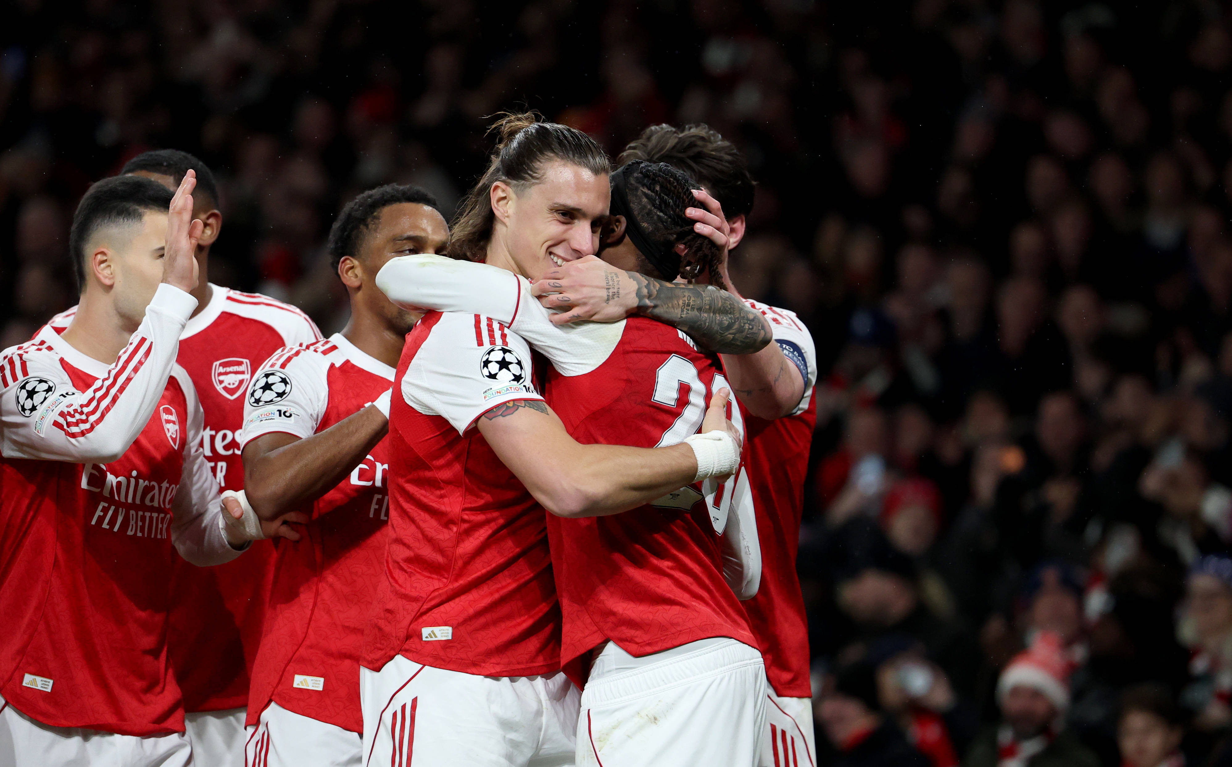 เมื่อวันที่ 26 พฤศจิกายน นักเตะอาร์เซนอล มาตุยดี้ (คนที่สามจากซ้าย) ฉลองกับเพื่อนร่วมทีมหลังจากทำประตูได้ ภาพถ่ายโดย หลี่ หยิง สำนักข่าวซินหัว