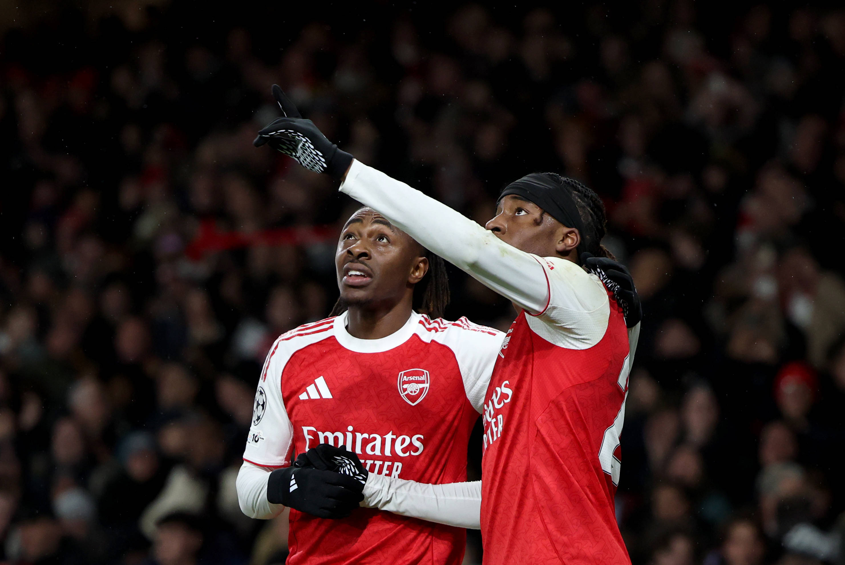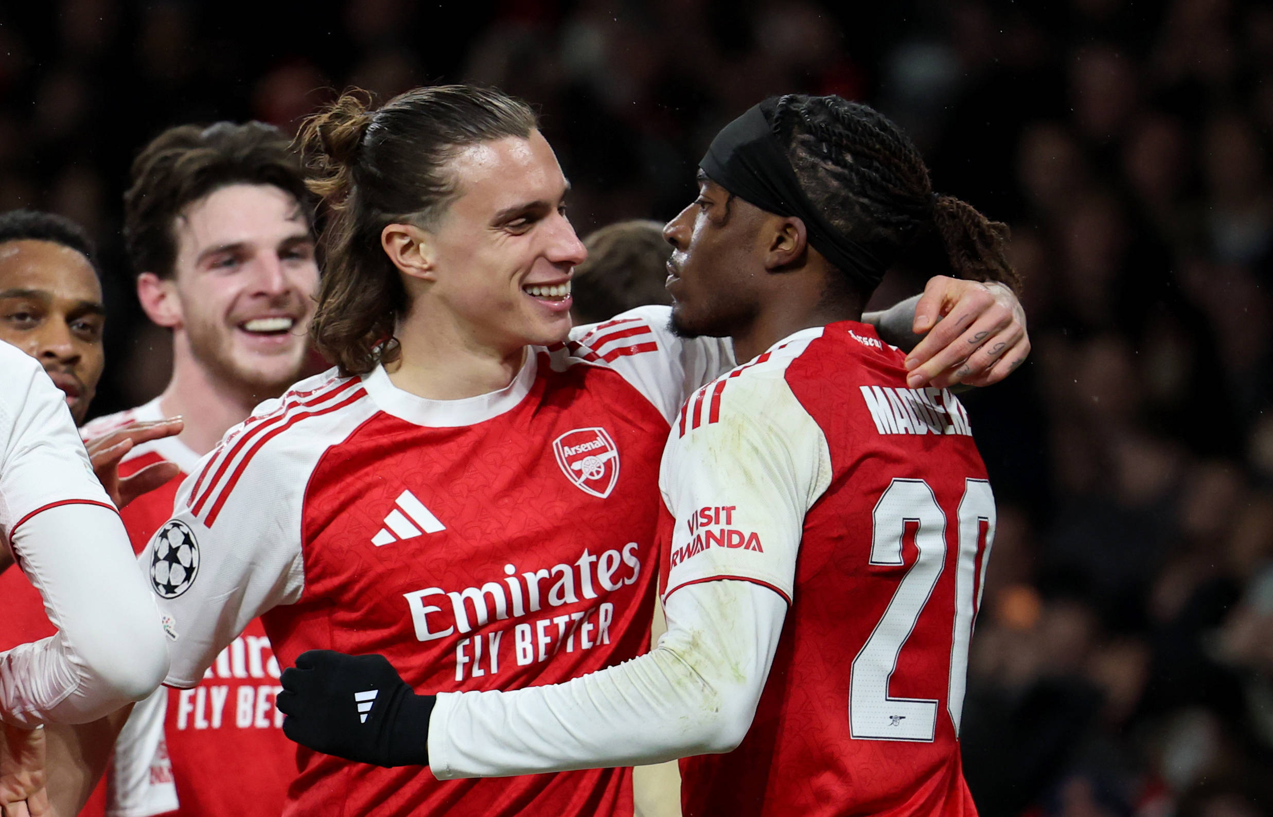 เมื่อวันที่ 26 พฤศจิกายน นักเตะอาร์เซนอล มาตุยดี้ (ขวา) ฉลองกับเพื่อนร่วมทีม เอเซ่ หลังจากทำประตูได้ ภาพโดย หลี่ หยิง สำนักข่าวซินหัว