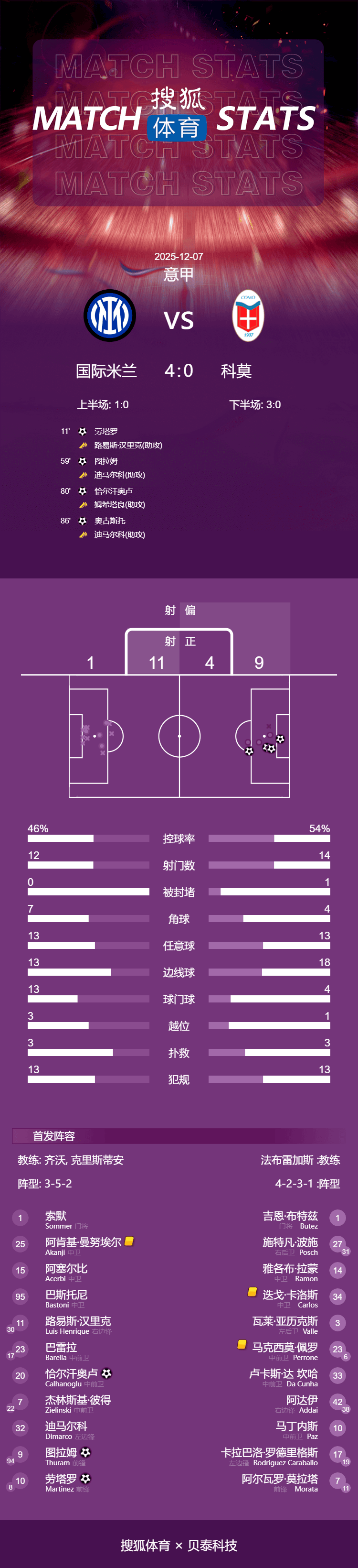 เวลา 01:00 น. ตามเวลาปักกิ่ง วันที่ 7 ธันวาคม อินเตอร์ มิลาน เปิดบ้านต้อนรับการมาเยือนของโคโม ในรอบที่ 14 ของเซเรีย อา ในครึ่งแรก ลอทาโร่ ทำประตูแรกให้ทีมจากการแอสซิสต์ของหลุยส์ เฮนริเก้ หลังจากพักครึ่ง ตูลัม, ชัลฮาโนกลู และออสตูโดซี ต่างทำประตูได้แต่ละคน ทำให้อินเตอร์โชว์ศักยภาพการโจมตีอย่างเต็มที่ ในที่สุด อินเตอร์ มิลาน ก็เอาชนะโคโมไปอย่างขาดลอย 4-0 ขึ้นนำเป็นจ่าฝูงของตารางคะแนนลีก โดยลงเล่นมากกว่าคู่แข่ง 1 นัด