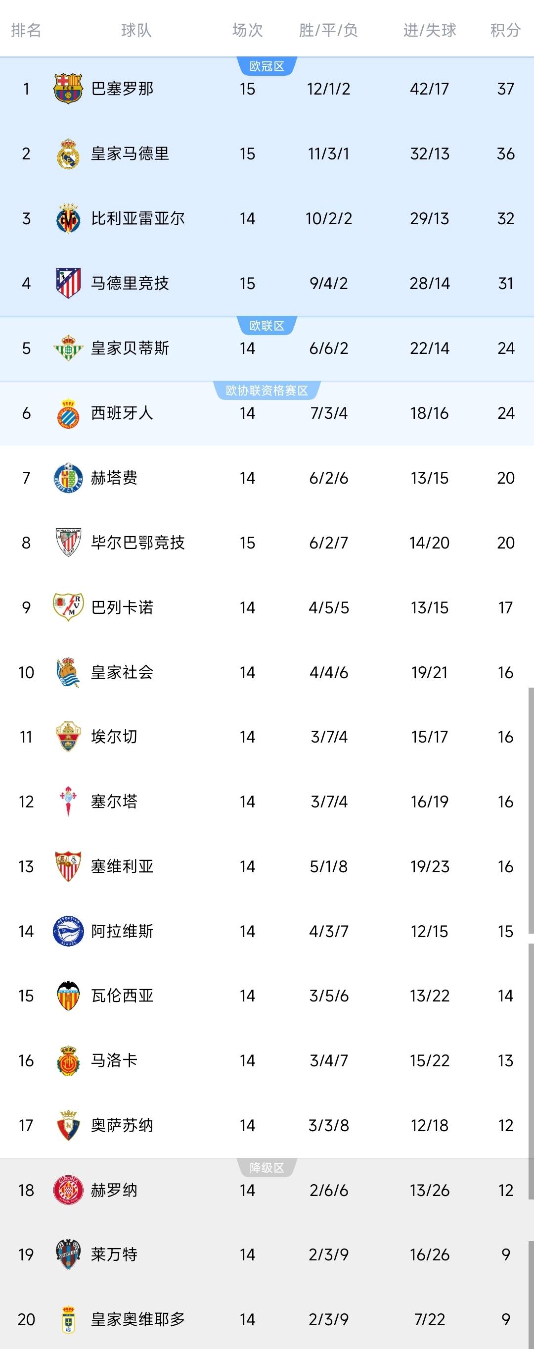 ตารางคะแนนลาลีกาได้ประกาศออกมาแล้วโดยเรอัล มาดริดอยู่ในอันดับที่สองหลังจากผ่านไป 15 นัด โดยชนะ 11 นัด เสมอ 3 นัด รวมคะแนนได้ 36 คะแนน ตามหลังบาร์เซโลนาทีมจ่าฝูงเพียง 1 คะแนน