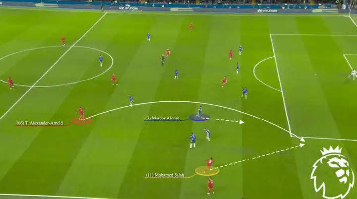 ตัวอย่างเช่น การเชื่อมต่อระหว่างซาลาห์และอาร์โนลด์ในภาพด้านบน เมื่ออาร์โนลด์ได้รับบอล ซาลาห์กำลังเดินเล่นตามเส้นข้างสนามโดยไม่เร่งความเร็ว