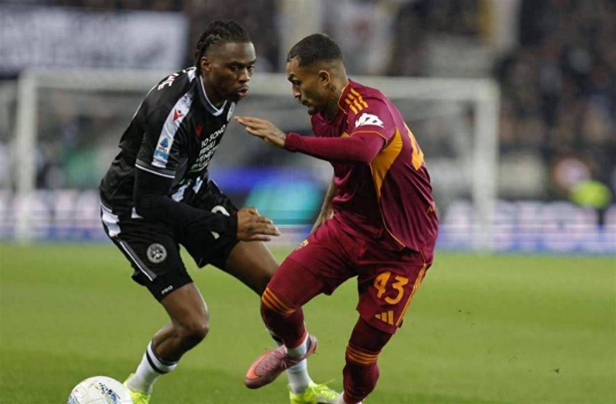 อย่างไรก็ตาม การแข่งขันดำเนินไปอย่างตรงกันข้ามกับการคาดการณ์ของผู้เชี่ยวชาญก่อนเกมอย่างสิ้นเชิง ตลอดครึ่งแรก โรม่าครองบอลได้ถึง 54% อย่างเหนือชั้น แต่กลับเล่นอย่างเชื่องช้าและขาดแรงบันดาลใจ ตลอด 45 นาทีแรก พวกเขาสามารถยิงตรงกรอบได้เพียง 3 ครั้งเท่านั้น โดยมีเพียง 1 ครั้งที่เข้ากรอบ ในทางตรงกันข้าม อูดิเนเซ่เลือกใช้แนวทางที่ตรงไปตรงมา ไม่ซับซ้อน สร้างความอันตรายได้มากกว่าด้วยการยิงตรงกรอบ 5 ครั้ง ในนาทีที่ 17 เคนาน เดวีส์ ของอูดิเนเซ่ได้รับใบเหลืองจากการประท้วงในจังหวะเกมรับ จากนั้นในนาทีที่ 34 โทมัส คริสเตนเซ่น ของทีมก็ถูกใบเหลืองเช่นกัน เหตุการณ์เหล่านี้สะท้อนให้เห็นภาพรวมว่าอูดิเนเซ่สามารถหยุดยั้งเกมรุกของโรมาได้อย่างมีประสิทธิภาพ ด้วยการเคลื่อนไหวที่กระตือรือร้นและการเล่นเกมรับที่ค่อนข้างดุดันเล็กน้อย