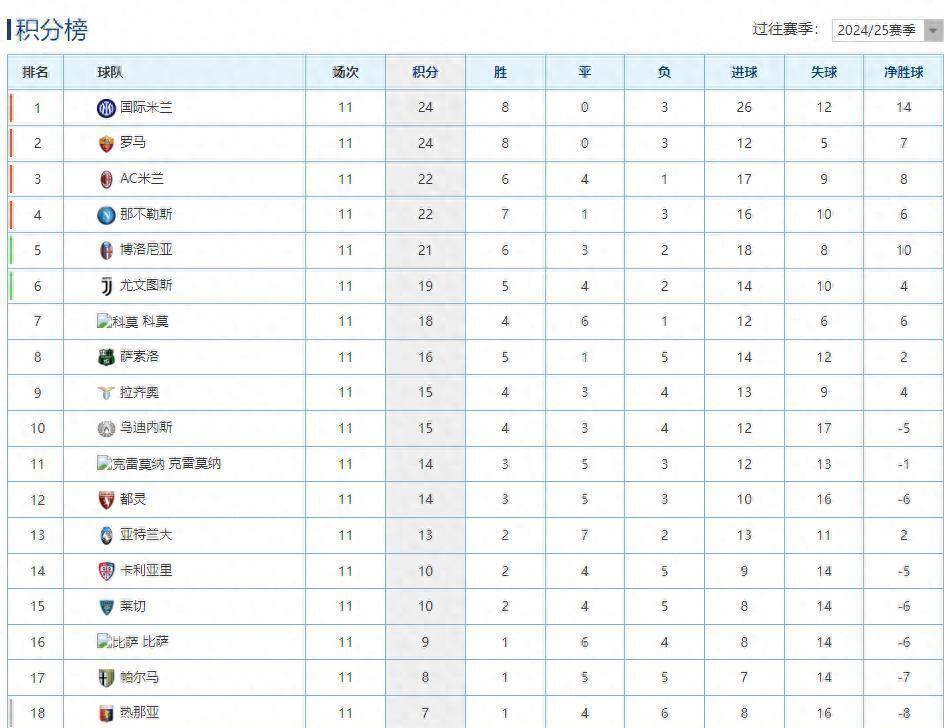 หลังจากการแข่งขันรอบที่ 11 ของเซเรีย อา จบลง ตารางคะแนนลีกมีการเปลี่ยนแปลงครั้งใหญ่ อินเตอร์ มิลาน คว้าชัยชนะในบ้านเหนือ ลาซิโอ 2-0 แซงหน้า โรม่า ขึ้นนำจ่าฝูงด้วยผลต่างประตูได้เสีย พร้อมกับขยายสถิติชนะติดต่อกันในลีกเป็นสามนัด ขณะที่ นาโปลี แชมป์เก่า พ่ายแพ้อย่างน่าตกใจ 2-0 ในเกมเยือน โบโลญญา ทำให้พวกเขาไม่ชนะและไม่ยิงประตูในสามนัดติดต่อกันในทุกรายการ และหล่นจากจ่าฝูงลงมาอยู่อันดับสี่ ผลลัพธ์เหล่านี้ไม่เพียงแต่เปลี่ยนแปลงการแข่งขันชิงแชมป์เท่านั้น แต่ยังเผยให้เห็นช่องโหว่ทางยุทธวิธีของยักษ์ใหญ่ดั้งเดิม พร้อมทั้งเน้นย้ำถึงการเติบโตของพลังใหม่ที่กำลังเกิดขึ้น