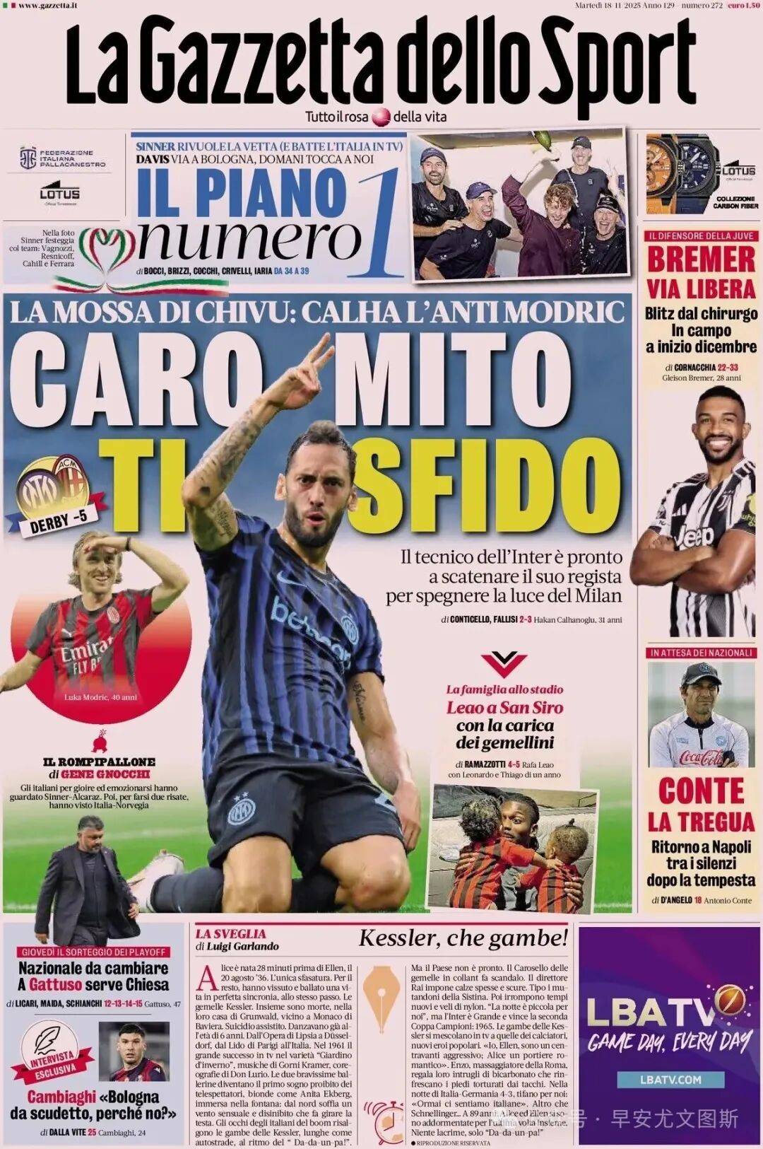 1. เรียน ตำนาน, ข้าขอท้าท่าน. การโต้กลับของซิวโควิช: Çalhanoğlu ปะทะ Modrić. ผู้จัดการทีม Nerazzurri เตรียมปล่อยผู้ควบคุมเกมในแดนกลางของเขาเพื่อหยุดประกายของมิลาน. Leão ที่ซานซิโร: ได้รับแรงบันดาลใจจากฝาแฝดของเขา.