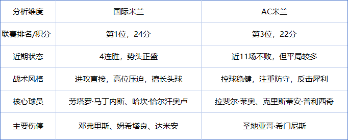· การต่อสู้เชิงยุทธวิธี: อินเตอร์ มิลาน อาจใช้ประโยชน์จากความสามารถทางอากาศและการกดดันอย่างมีประสิทธิภาพใกล้เขตโทษของฝ่ายตรงข้ามเพื่อสร้างโอกาสอันตราย ขณะที่ เอซี มิลาน จะพึ่งพาการป้องกันที่แข็งแกร่ง (เสียเพียงเก้าประตูในฤดูกาลนี้) และความสามารถในการเลี้ยงบอลของผู้เล่นแต่ละคน (ทีมอยู่ในอันดับที่สามในเซเรียอาสำหรับการเลี้ยงบอลสำเร็จ) เพื่อสร้างโอกาส
