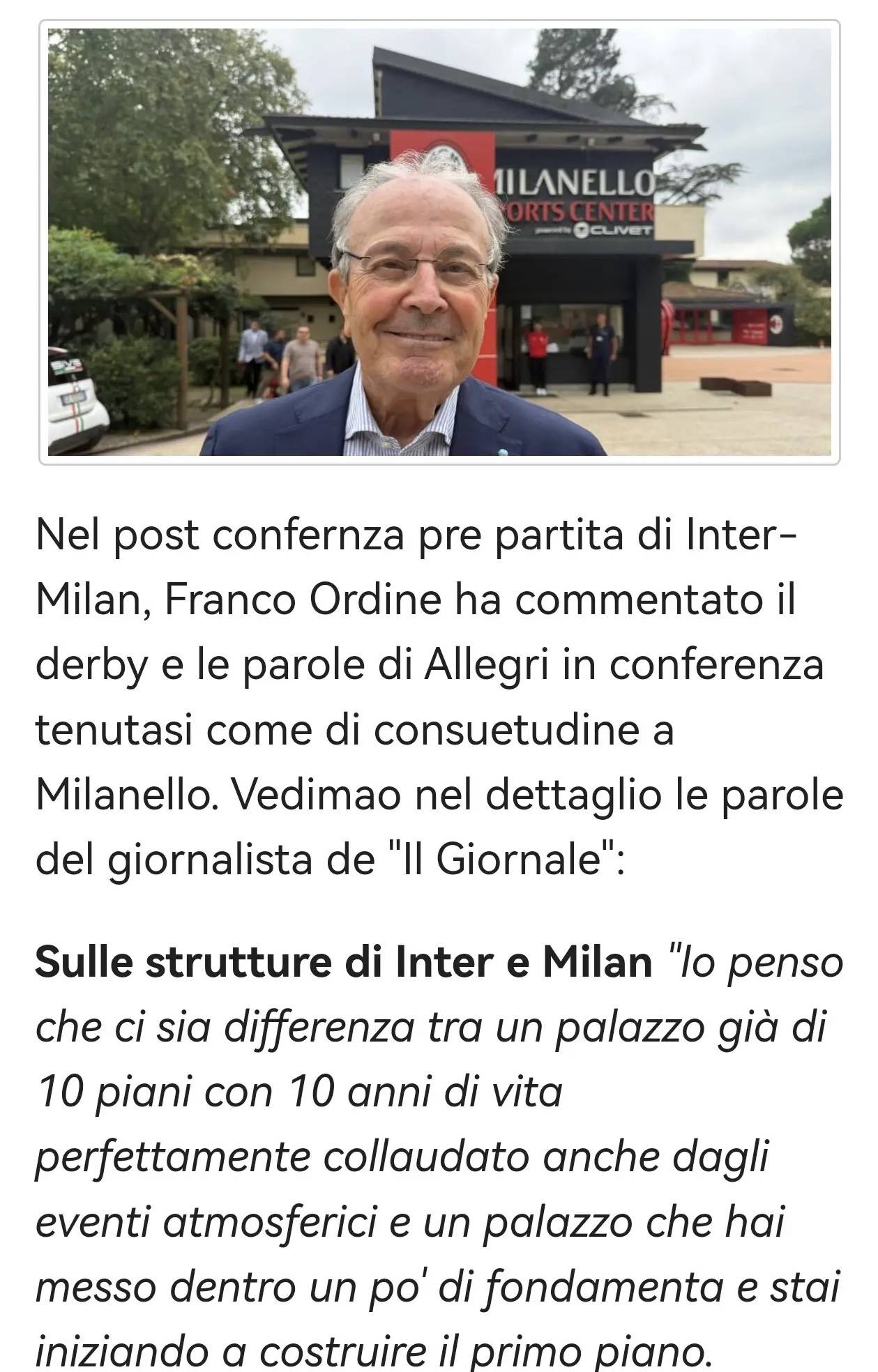 ฟรังโก ออร์ดินี ผู้สื่อข่าวจากเดลี่ ได้แสดงความคิดเห็นเกี่ยวกับเกมการแข่งขันและถ้อยแถลงของอัลเลกรีที่มิลาเนลโลหลังการแถลงข่าวก่อนเกม: