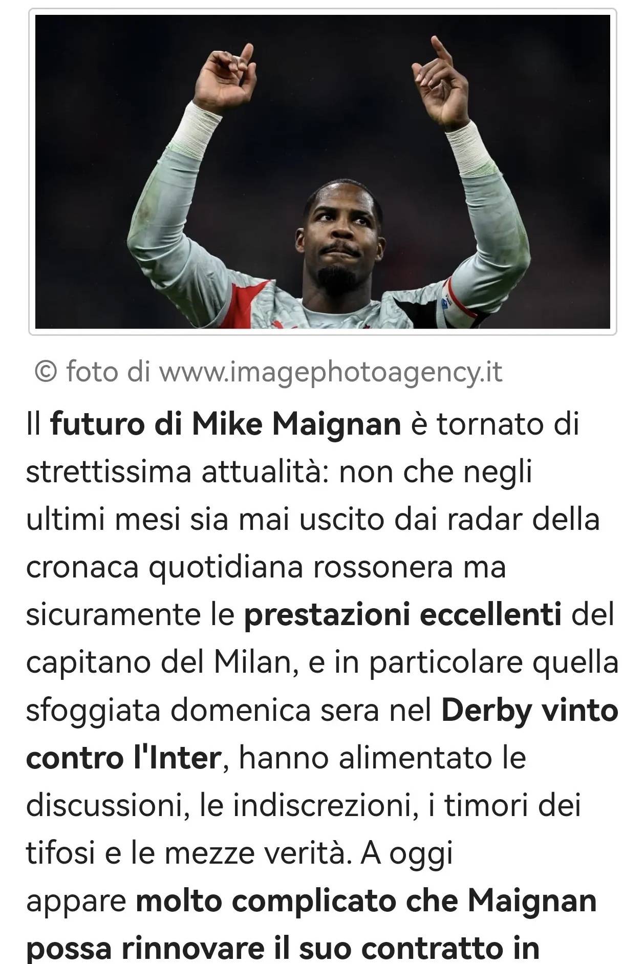 อนาคตของไมค์ เมญ็อง กลับมาเป็นจุดสนใจอีกครั้ง – เขาอยู่ในศูนย์กลางของรายงานที่เกี่ยวข้องกับมิลานตลอดหลายเดือนที่ผ่านมา ผลงานอันโดดเด่นของกัปตันทีมในฤดูกาลนี้ โดยเฉพาะการแสดงฝีมืออันยอดเยี่ยมในศึกมิลานดาร์บี้เมื่อคืนวันอาทิตย์ที่ผ่านมา ได้จุดประกายการพูดคุย ข่าวลือ ความกังวลของแฟนบอล และข้อมูลที่ผิดพลาดเกี่ยวกับการต่อสัญญาของเขาในปัจจุบัน ความเป็นไปได้ที่ไมญ็องจะต่อสัญญาออกไปเกินกว่าปี 2026 ยังคงต่ำมาก (แม้ว่าจะมีรายงานว่ามิลานพร้อมที่จะเริ่มเจรจาใหม่ แต่ดูเหมือนจะเป็นเรื่องยากเนื่องจากมีหลายสโมสรที่สนใจ) นี่ยังคงเป็นข้อสันนิษฐานพื้นฐาน