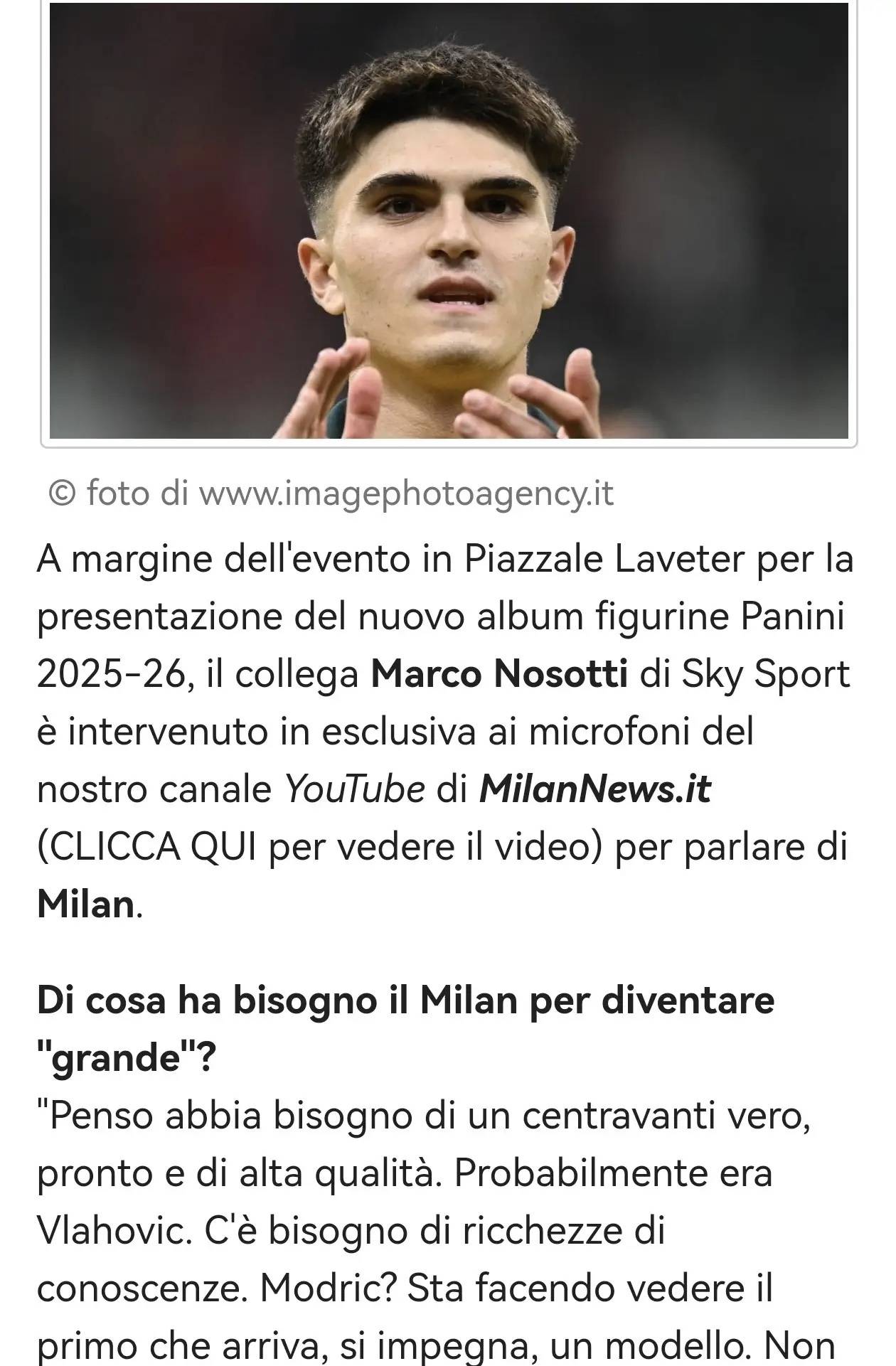 เอซี มิลานต้องการอะไรเพื่อที่จะกลายเป็นทีมที่น่าเกรงขาม? "ผมเชื่อว่าทีมต้องการกองหน้าตัวเป้าที่แท้จริงและพร้อมลงสนามในระดับสูงสุด – บางที วลาโฮวิช อาจเป็นตัวเลือกที่เหมาะสมที่สุดก็ได้ นอกจากนี้ ทีมยังต้องการประสบการณ์ที่สั่งสมมามากมาย โมดริช? เขายังคงแสดงให้เห็นถึงมาตรฐานระดับสูง มีความทุ่มเทอย่างมหาศาล และเป็นแบบอย่างที่ดีเยี่ยม"