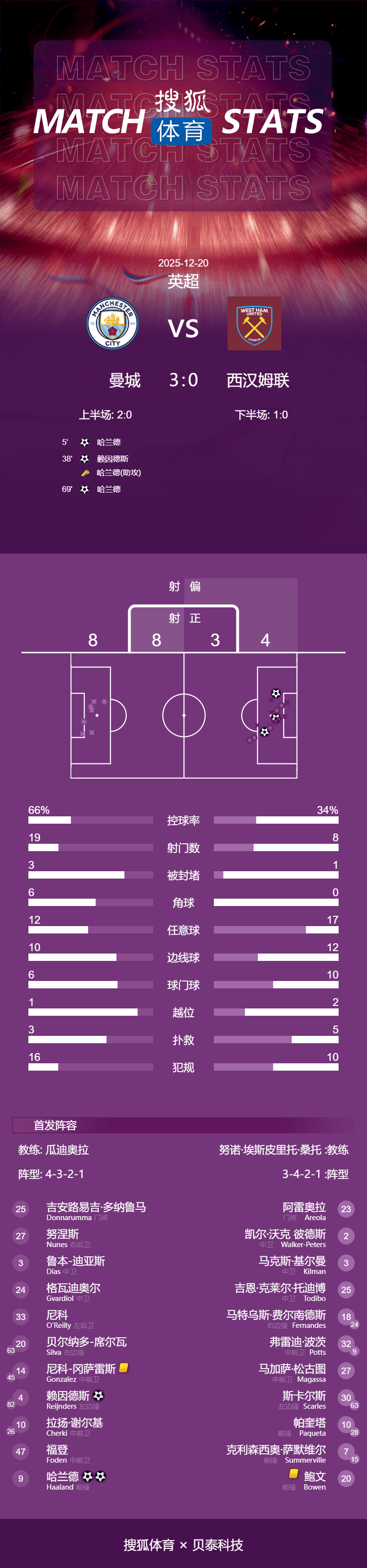 เวลา 23:00 น. ตามเวลาปักกิ่ง วันที่ 20 ธันวาคม การแข่งขันพรีเมียร์ลีกฤดูกาล 2025-2026 รอบที่ 17 มีการแข่งขันนัดสำคัญที่แมนเชสเตอร์ ซิตี้ เปิดบ้านต้อนรับการมาเยือนของเวสต์แฮม ยูไนเต็ด ในครึ่งแรก เออร์ลิง ฮาแลนด์ เปิดสกอร์ด้วยการยิงจ่อ ๆ ให้เจ้าบ้านขึ้นนำอย่างรวดเร็ว จากนั้นฮาแลนด์จ่ายบอลข้ามหน้าประตูให้ไรอัน กราเวนเบิร์ช ยิงเข้าเสาไกลอย่างสวยงาม ขยายความได้เปรียบของซิตี้ออกไปในครึ่งหลัง ความผิดพลาดในการเคลียร์บอลของเวสต์แฮมทำให้ฮาแลนด์สามารถยิงเข้าประตูด้วยเท้าซ้ายได้ ในที่สุด แมนเชสเตอร์ ซิตี้ ก็เอาชนะเวสต์แฮม ยูไนเต็ด ไปได้ 3-0 ในบ้าน ทำให้พวกเขาชนะติดต่อกันในทุกรายการเป็นนัดที่ 7