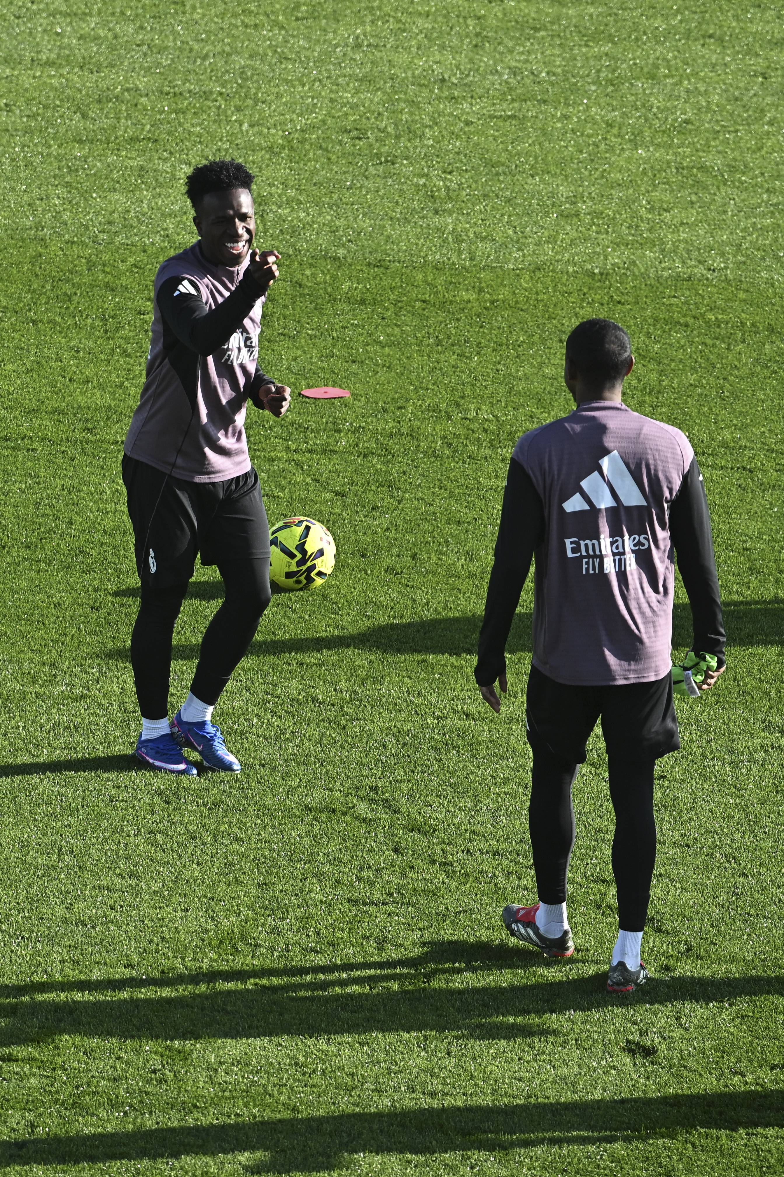 เมื่อวันที่ 30 ธันวาคม นักเตะเรอัล มาดริด คีเลียน เอ็มบัปเป้ (ซ้าย) และ วินิซิอุส จูเนียร์ (ด้านหน้า) ระหว่างการฝึกซ้อม ซินหัว/EPA