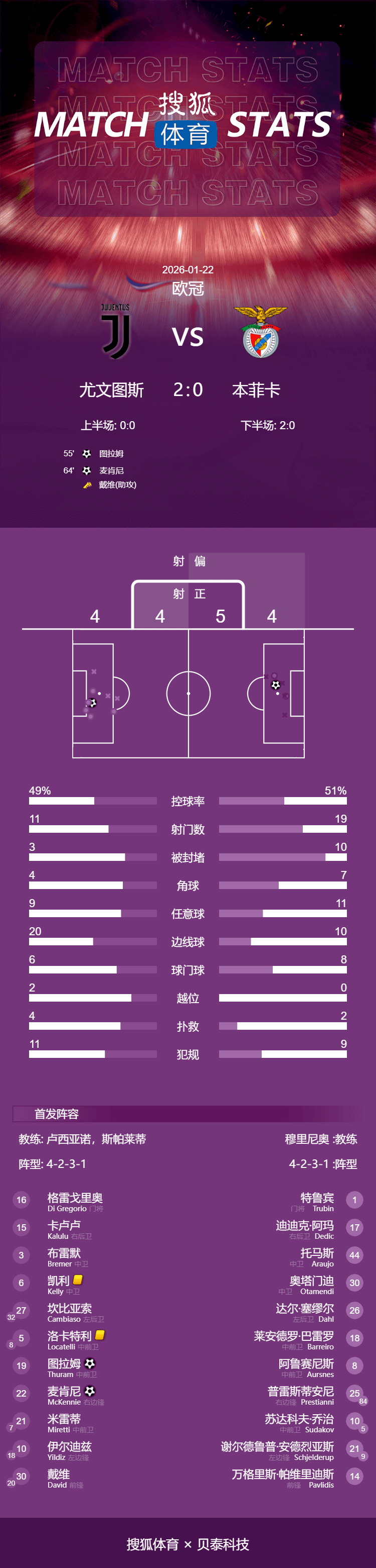 เวลา 04:00 น. ตามเวลาปักกิ่ง วันที่ 22 มกราคม ยูเวนตุสเปิดบ้านต้อนรับเบนฟิก้าที่สนามอัลลิอันซ์ สเตเดียม ในรอบที่เจ็ดของรอบแบ่งกลุ่มยูฟ่าแชมเปียนส์ลีก ฤดูกาล 2025/26ครึ่งแรกทั้งสองทีมผลัดกันโจมตี โดยแต่ละทีมมีโอกาสยิงชนเสาหลายครั้งแต่ไม่สามารถทำประตูได้ ยูเวนตุสเร่งจังหวะเกมในบ้านในครึ่งหลัง โดยตูรานทำประตูเบิกร่องและแม็คเคนนีทำประตูที่สองให้ทีมนำห่าง ขณะที่เบนฟิก้าพลาดโอกาสยิงจุดโทษ ยูเวนตุสคว้าชัยชนะสำคัญ 2-0 เหนือเบนฟิก้า