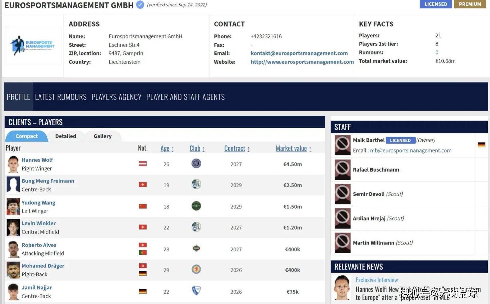 บันทึกแสดงให้เห็นว่า EuroSportsManagement ดำเนินงานในหลายประเทศรวมถึงเยอรมนี ออสเตรีย สวิตเซอร์แลนด์ ลักเซมเบิร์ก ลิกเตนสไตน์ และเบลเยียม โดยเน้นการจัดการลีกของเยอรมันและสวิตเซอร์แลนด์เป็นหลัก กองหน้าระดับโลก โรเบิร์ต เลวานดอฟสกี้ ได้ร่วมงานกับพวกเขาเป็นเวลาหนึ่งทศวรรษ นอกเหนือจากสวิสซูเปอร์ลีกแล้ว ลีกต่างๆ เช่น บุนเดสลีกา, 2. บุนเดสลีกา, ออสเตรียบุนเดสลีกา และเบลเยียมดิวิชั่นหนึ่ง เอ กำลังรอการเข้าร่วมของหวัง หยูตงดิวิชั่นหนึ่งเอของเบลเยียมเป็นอีกหนึ่งจุดหมายปลายทางที่น่าสนใจ อดีตกองหน้าทีมชาติจีน ตง ฟางจั่ว เคยเล่นให้กับอันท์เวิร์ป ซึ่งเขาคว้ารางวัลดาวซัลโวสูงสุดของดิวิชั่นสองเอของเบลเยียมมาแล้ว