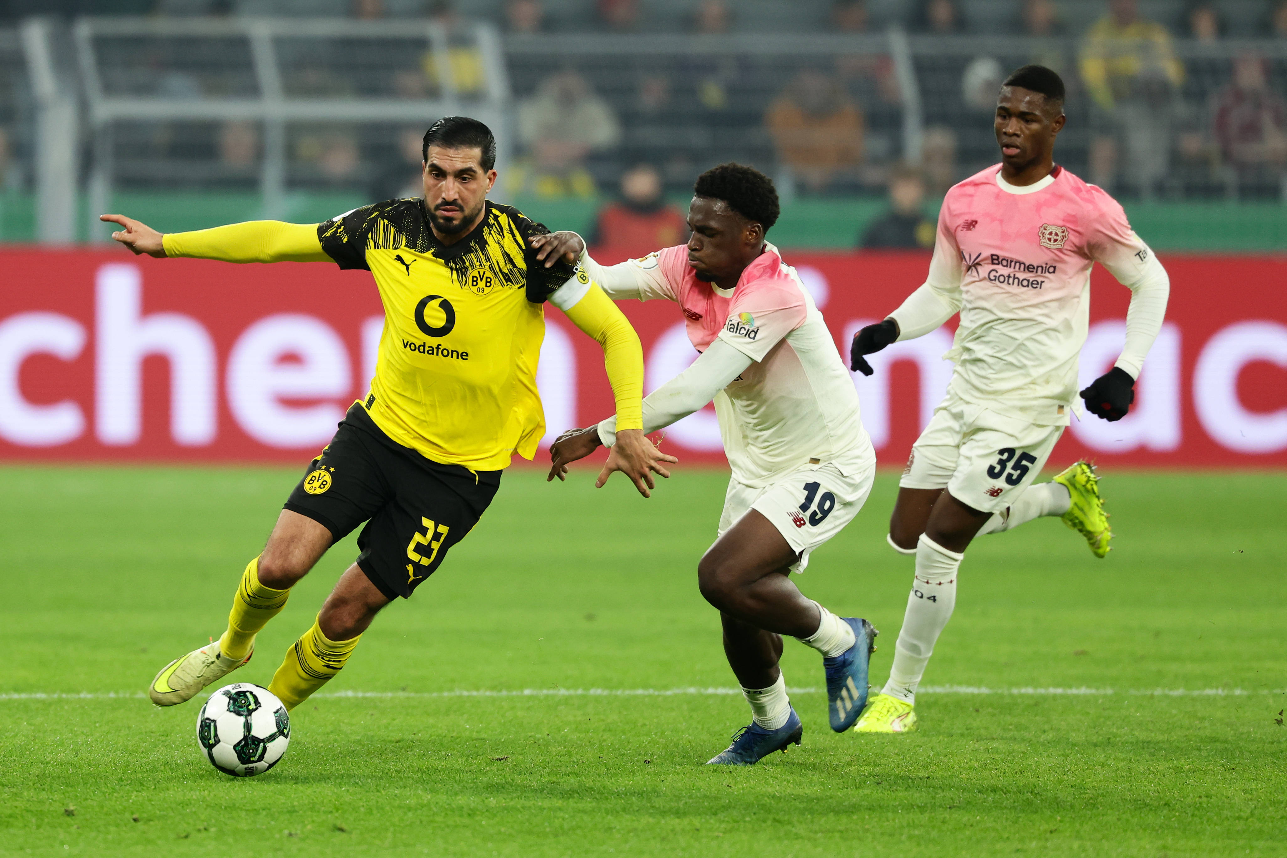 เมื่อวันที่ 2 ธันวาคม เอ็มเร่ ชาน ของโบรุสเซีย ดอร์ทมุนด์ (ซ้าย) เข้าปะทะกับ พุกกี้ ของไบเออร์ เลเวอร์คูเซ่น (กลาง) ระหว่างการแข่งขัน สำนักข่าวซินหัว (ภาพโดย Joachim Bivallés)